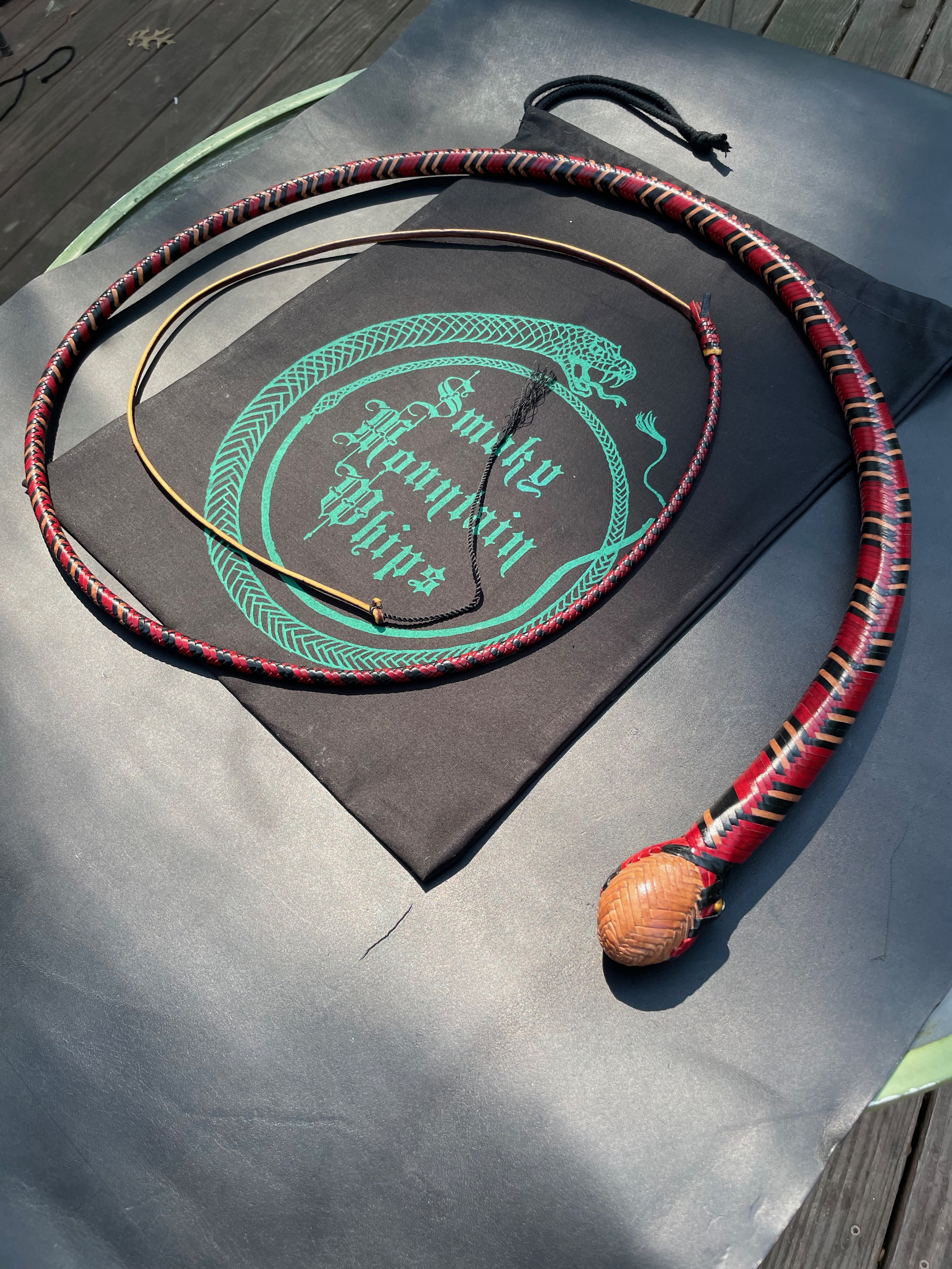 choose from white latigo, black dyed latigo, or alum latigo which is burgundy with a yellow center. to make sure it is the right fit for your whip I need to know the length of your whip. (Purchase now to reserve; shipping calculated after purchase. ) Please write the customizations in the comments when you check out or message me at contact@smokymountainwhips.com