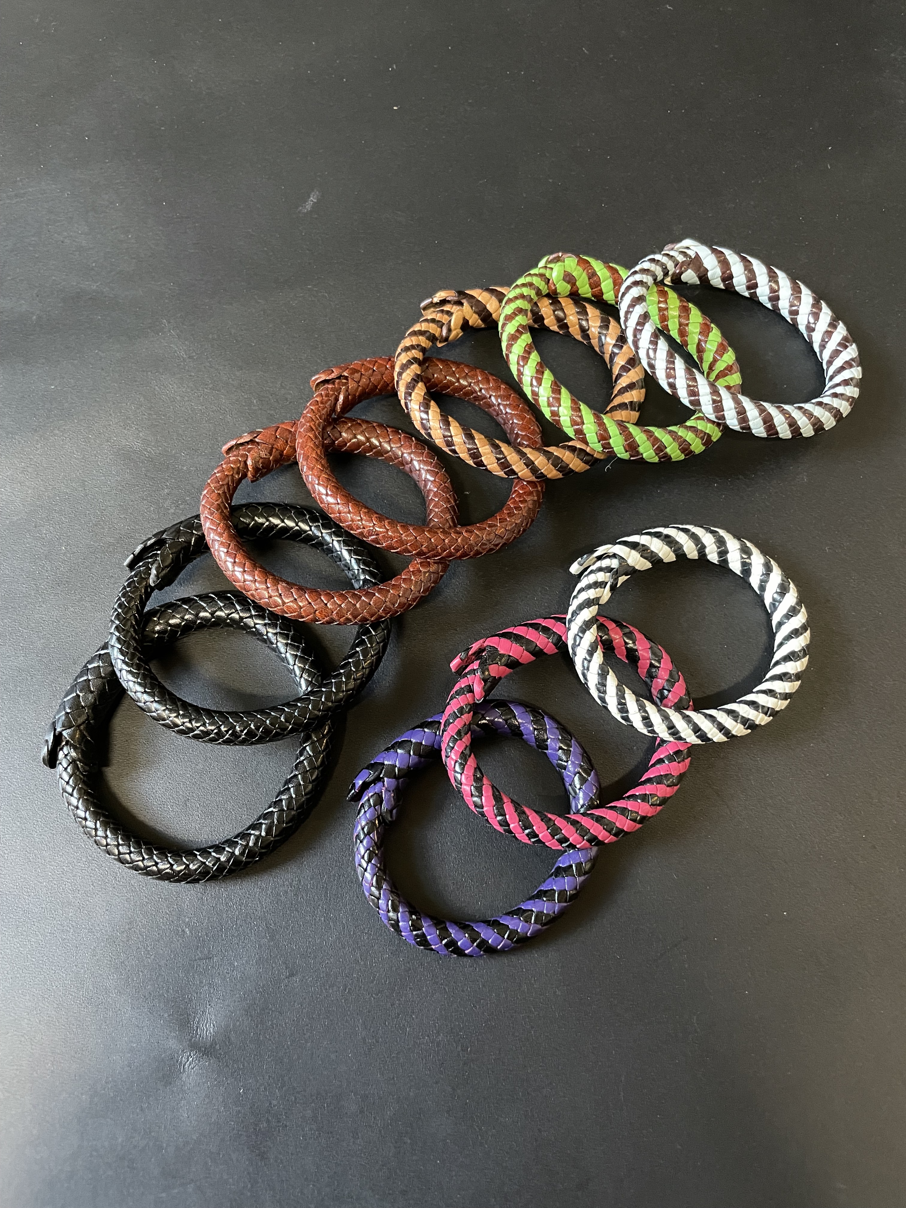 The bracelet is easy to wear and take off with a long-lasting marine grade elastic central core designed to stretch over the hand and fit securely upon the wrist. Elastic center is encased by hand-cut and beveled kangaroo leather lace with all-natural resin shellac for shine. The color options are on the pricing guide page. Choose one or two colors. The sizes are small(7inch circumbference), medium(8inch), or large(9inch). (Purchase now to reserve; shipping calculated after purchase. ) When you checkout please list customizations in the comments or email me the details to contact@smokymountainwhips.com